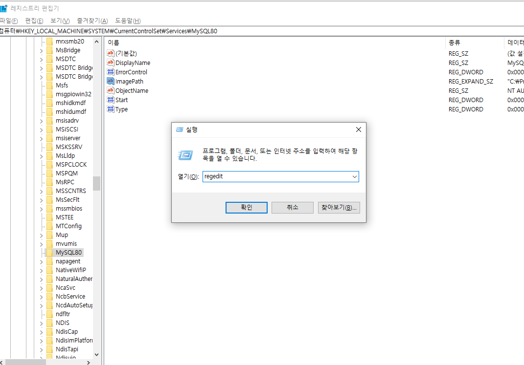 아래 경로에 있는 MySQL 레지스트리에 들어간다.