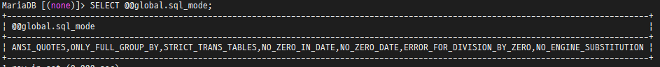 sql_mode="ANSI_QUOTES,ONLY_FULL_GROUP_BY,NO_ZERO_IN_DATE,NO_ZERO_DATE,ERROR_FOR_DIVISION_BY_ZERO,NO_ENGINE_SUBSTITUTION"
