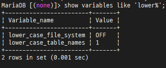 lower_case_table_names 변수 값 조회