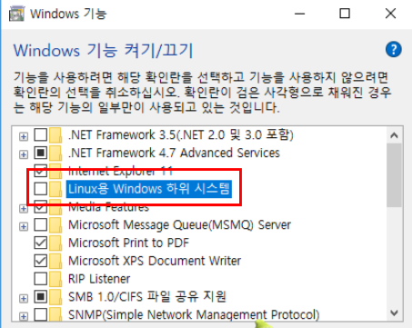 3. Windows 기능 켜기 (Linux 시스템 사용체크)