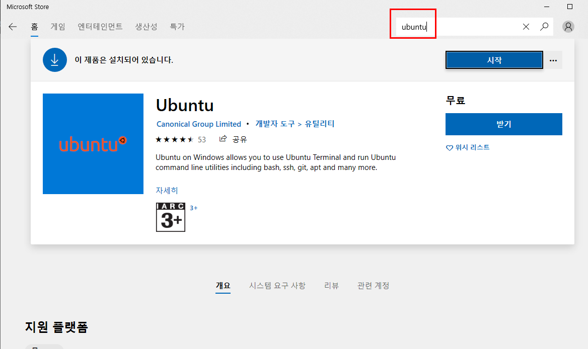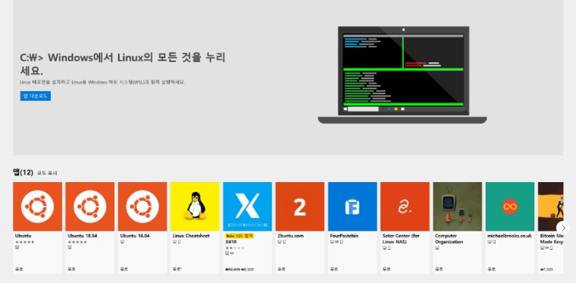 Microsoft Store의 Ubuntu 앱을 설치하여 리눅스 사용이 가능합니다.