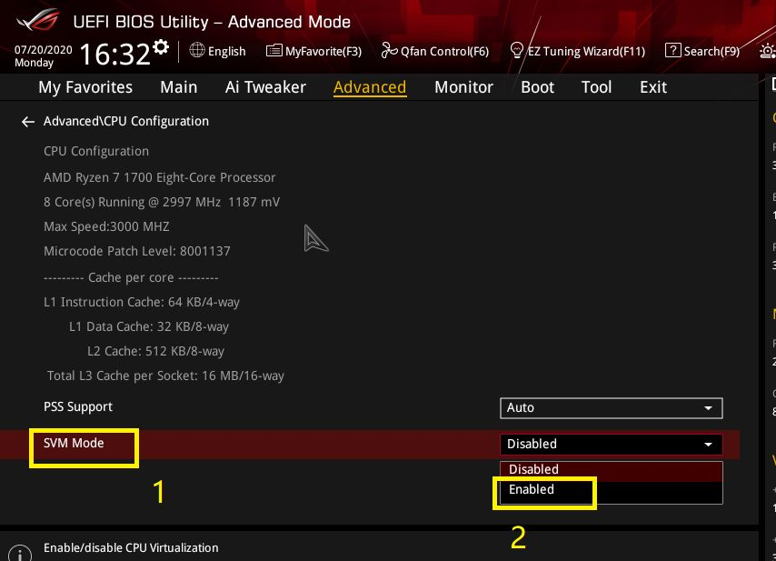자신의 메인보드 제조사에서 제공해주는 GUI안에 가상화기능을 켜줍니다. .