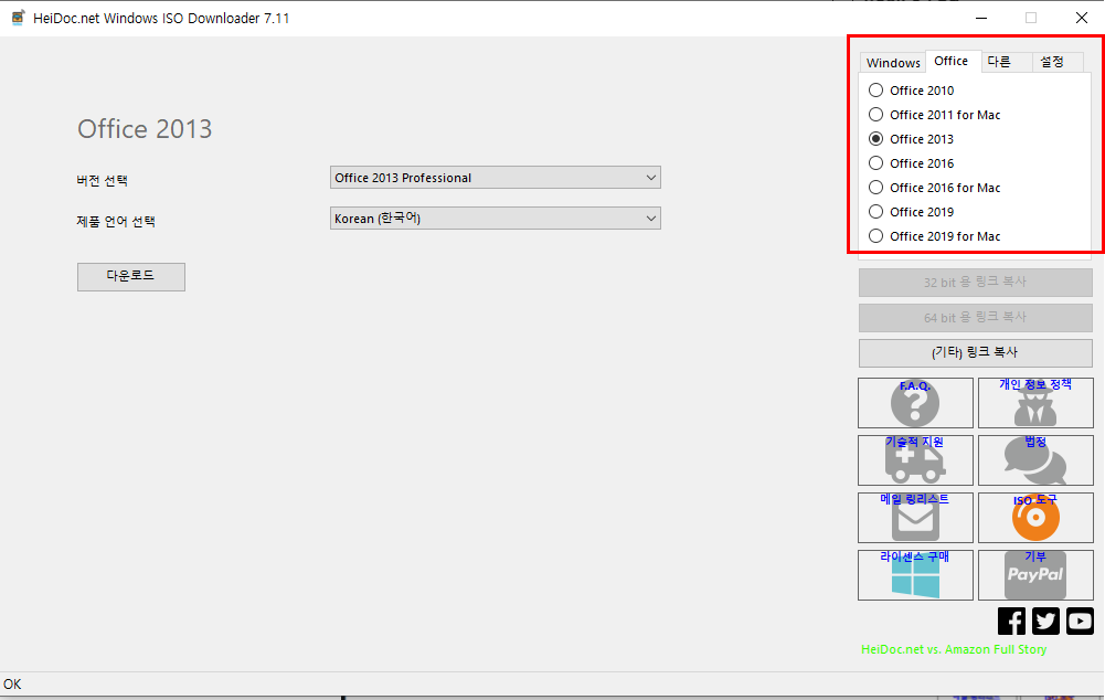 오피스는 2010, 2013, 2016, 2019 총 4가지이며 window용과 Mac용 을 제공합니다.