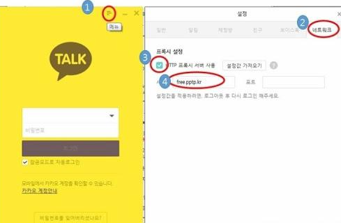 PC카톡에 메뉴 > 네트워크 > 프록시 설정