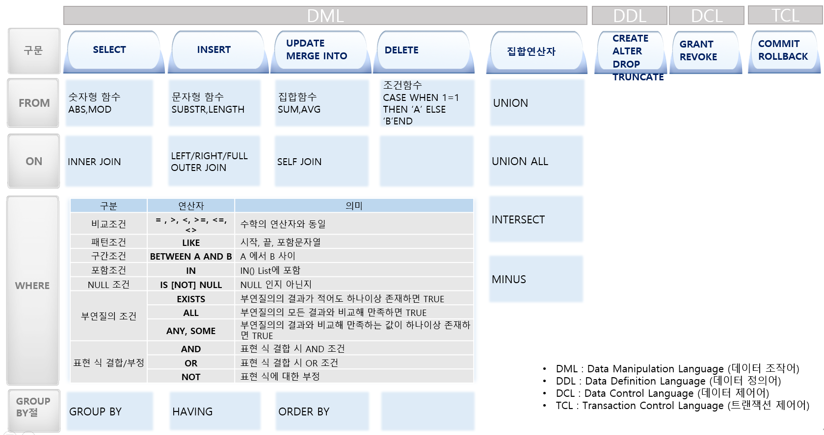SQL(Structured Query Language)의 종류에는 데이터 정의(DDL), 데이터 조작(DML), 데이터 제어(DCL)가 있다.
