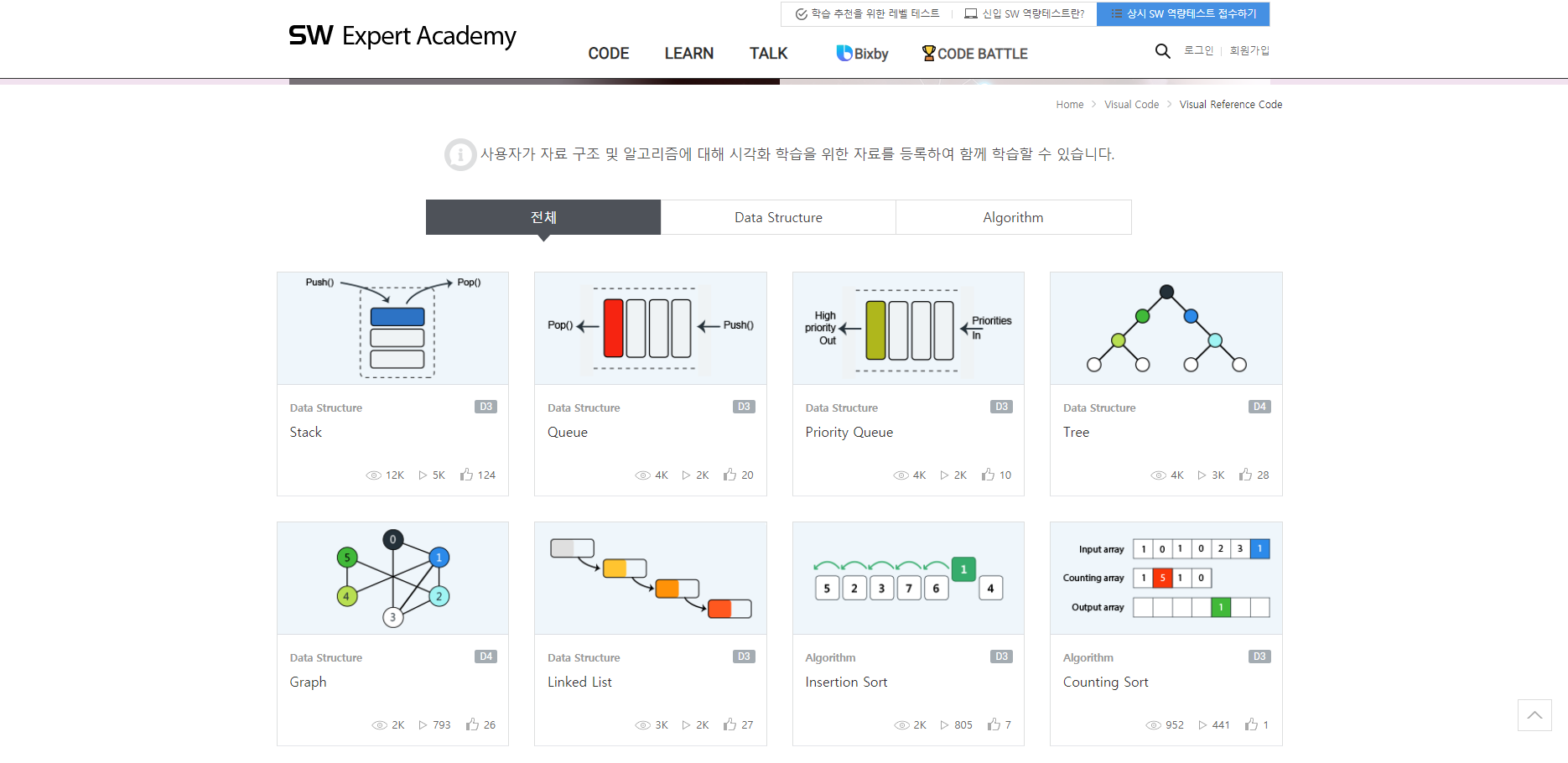 데이터 구조와 알고리즘별로 직관적인 흐름과 비주얼 뷰를 제공해주어서 기본적인 알고리즘 공부에 용이하다