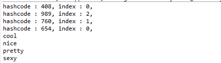 System.out.println("hashcode : "+gethashCode(key)+", index : " +index + ", ");
