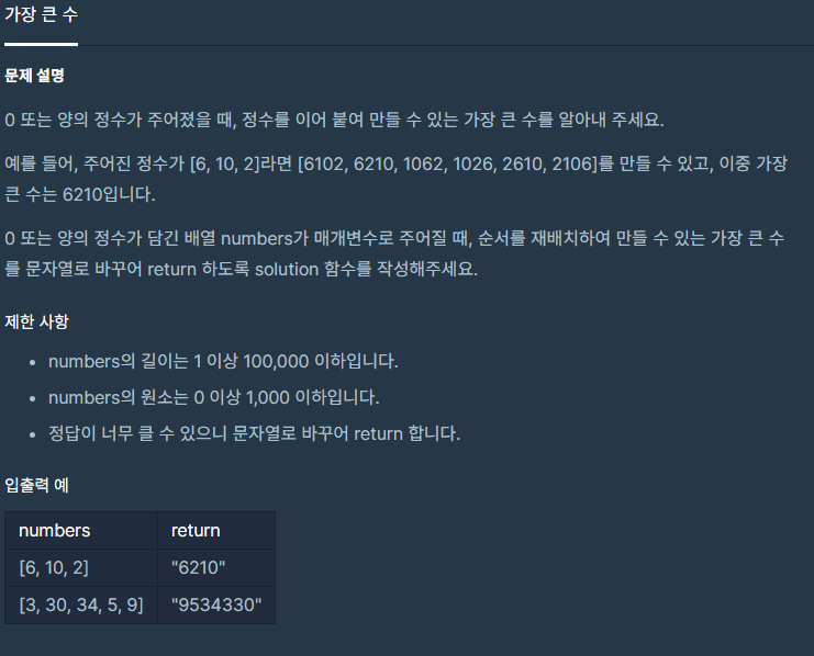 이 문제는 주어진 배열의 숫자를 문자열로 형변환후 서로 값들을 붙여서 비교후