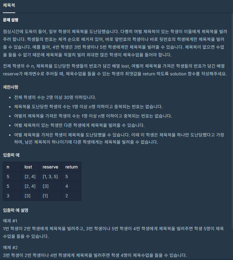 점심시간에 도둑이 들어, 일부 학생이 체육복을 도난당했습니다. 다행히 여벌 체육복이 있는 학생이 이들에게 체육복을 빌려주려 합니다. 학생들의 번호는 체격 순으로 매겨져 있어, 바로 앞번
