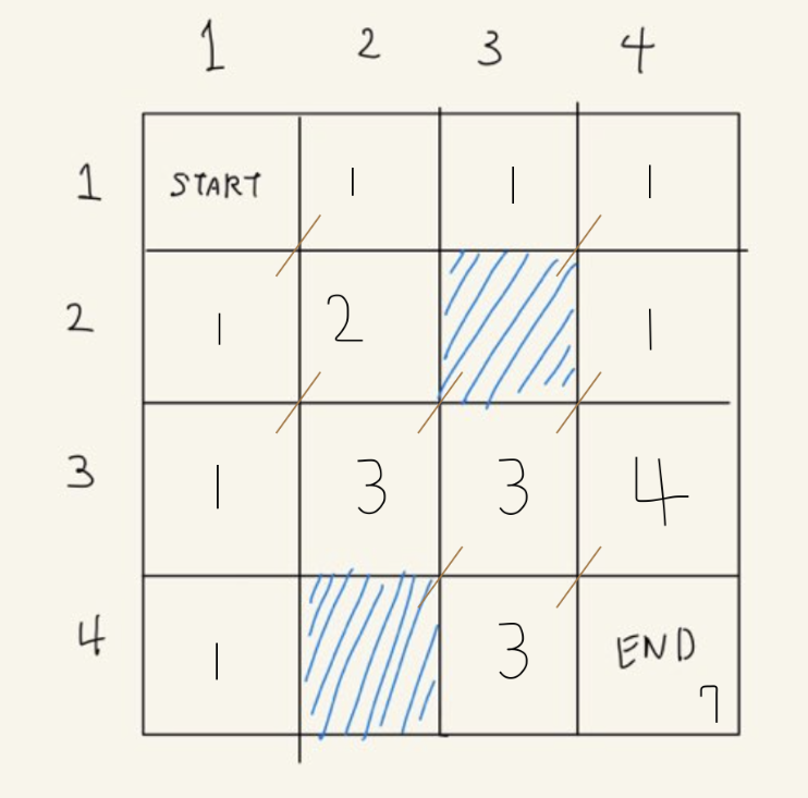 오른쪽, 아래로만 움직이면서 침수된 판을 제외하고 지나갈수 있는 경로중 최소값 경로의 갯수를 구하는 문제이다.
