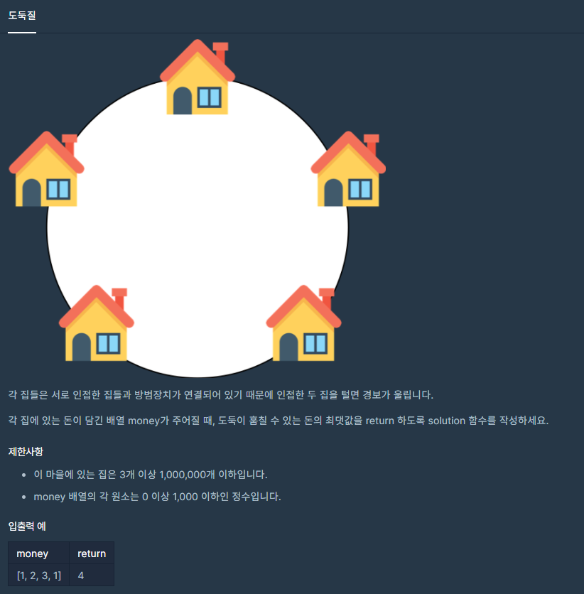 도둑이 어느 마을을 털 계획을 하고 있습니다. 이 마을의 모든 집들은 아래 그림과 같이 동그랗게 배치되어 있습니다. 각 집들은 서로 인접한 집들과 방범장치가 연결되어 있기 때문에 인접한