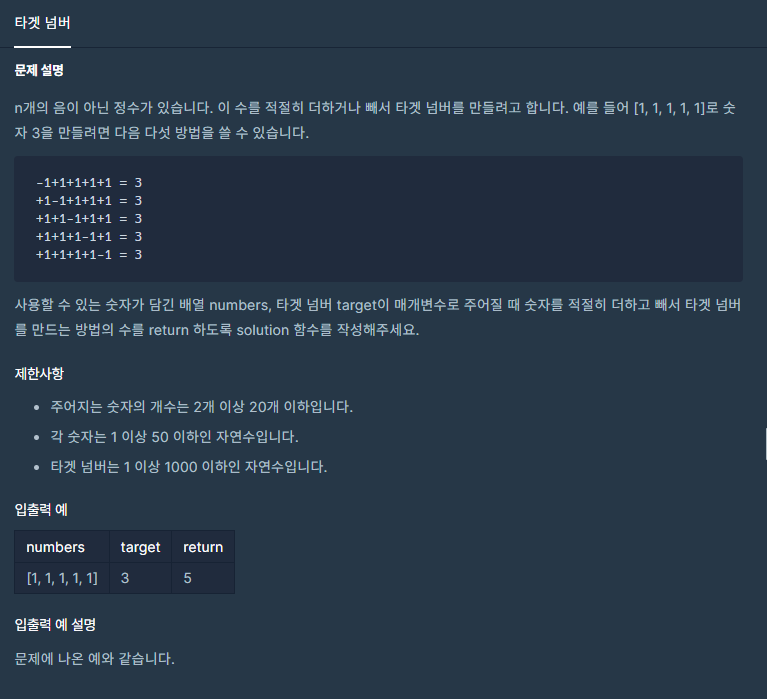n개의 음이 아닌 정수가 있습니다. 이 수를 적절히 더하거나 빼서 타겟 넘버를 만들려고 합니다. 예를 들어 [1, 1, 1, 1, 1]로 숫자 3을 만들려면 다음 다섯 방법을 쓸 수 있습니다. -1+1+1+1+1 = 3 +1-1+1+1+