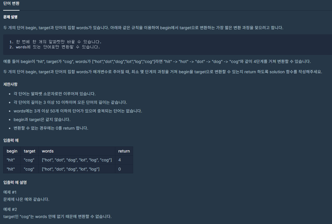 두 개의 단어 begin, target과 단어의 집합 words가 있습니다. 아래와 같은 규칙을 이용하여 begin에서 target으로 변환하는 가장 짧은 변환 과정을 찾으려고 합니다. 1. 한 번에 한 개의 알파벳만 바꿀 수
