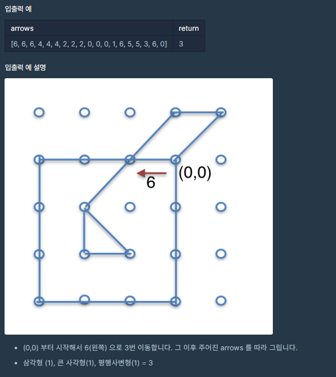 int [] arrows = {6, 6, 6, 4, 4, 4, 2, 2, 2, 0, 0, 0, 1, 6, 5, 5, 3, 6, 0}; //result = 3