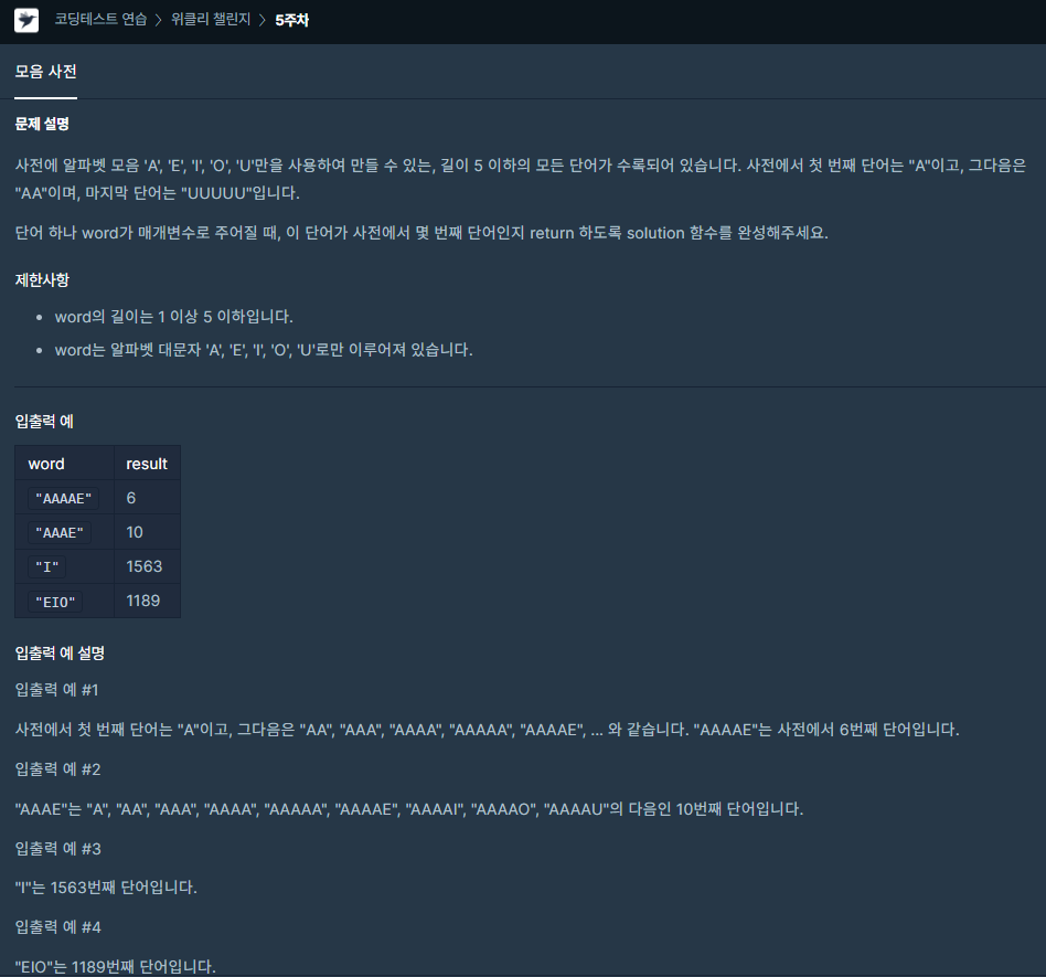 사전의 조합이 "AEIOU" 뿐 아니라 더 긴 조합이 INPUT으로 주어진다해도 문제를 풀 수 있을 것이다.