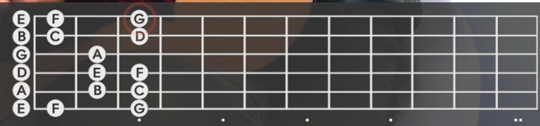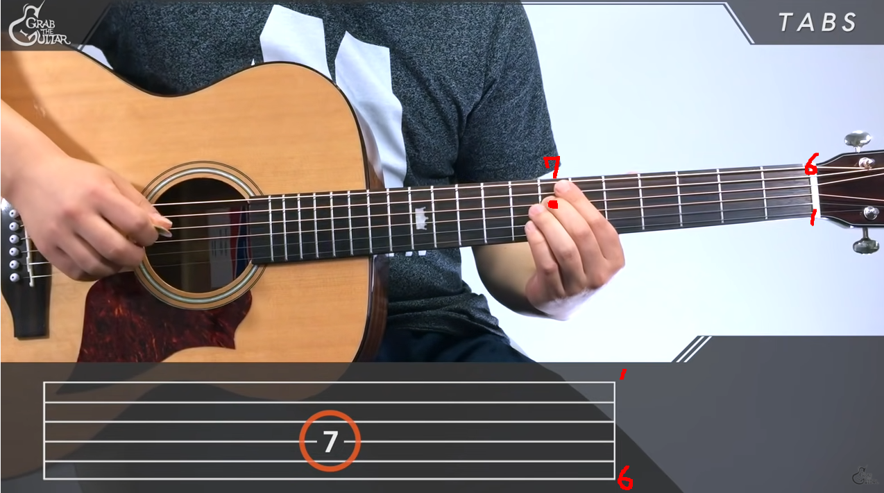 기타의 4번줄의 7번 프랫(칸)을 눌러주면 된다.