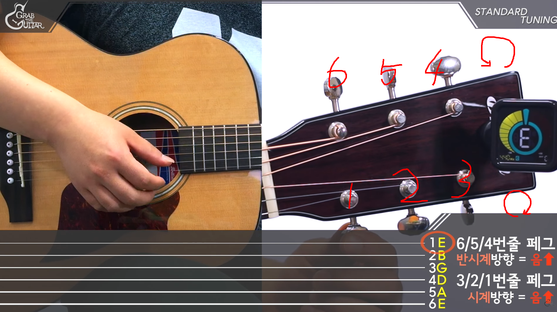 기타는 가장 얇고 밑에 있는 줄부터 1번~ 위에 두껍고 굵은 소리가나는 줄까지 6번이다.