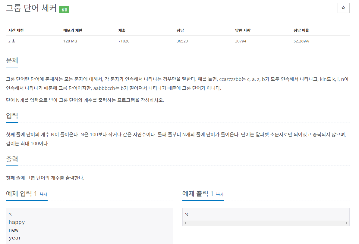 그룹 단어란 단어에 존재하는 모든 문자에 대해서, 각 문자가 연속해서 나타나는 경우만을 말한다. 예를 들면, ccazzzzbb는 c, a, z, b가 모두 연속해서 나타나고, kin도 k, i, n이 연속해서 나타나기 때