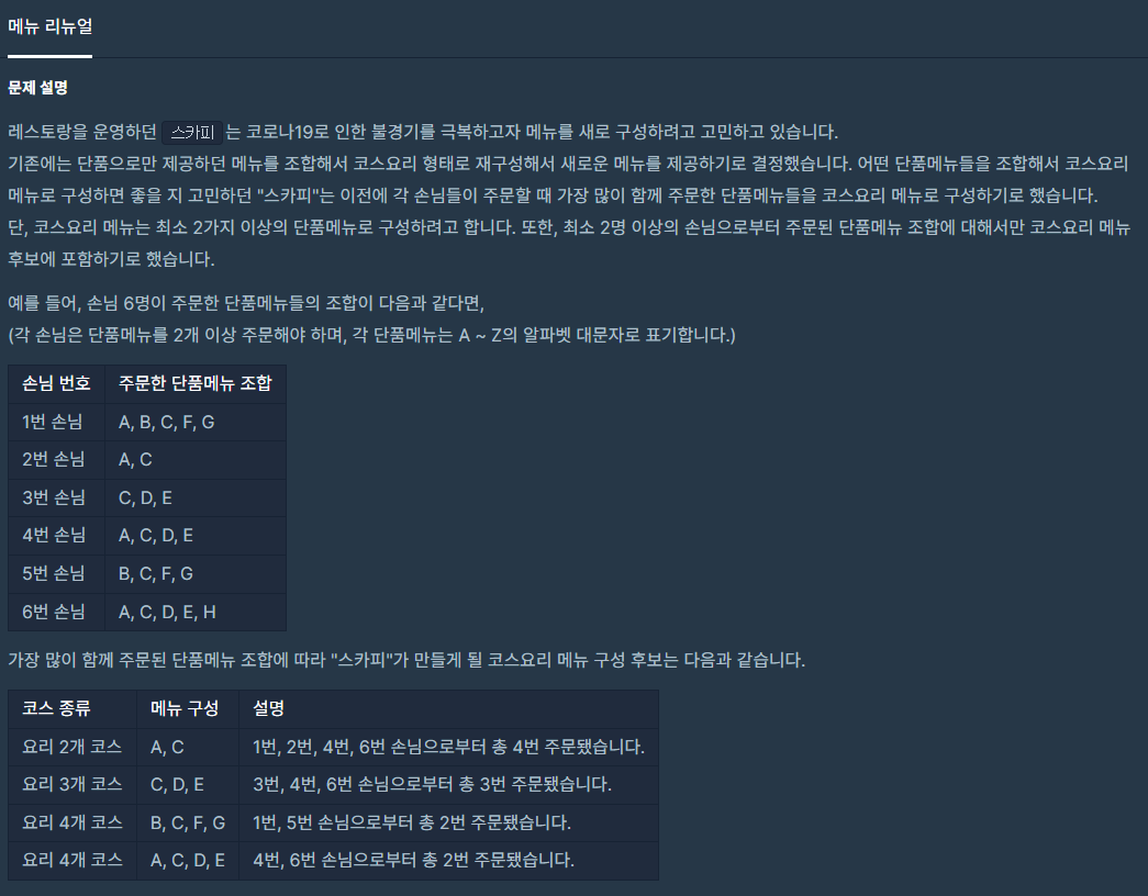 레스토랑을 운영하던 스카피는 코로나19로 인한 불경기를 극복하고자 메뉴를 새로 구성하려고 고민하고 있습니다. 기존에는 단품으로만 제공하던 메뉴를 조합해서 코스요리 형태로 재구성해서