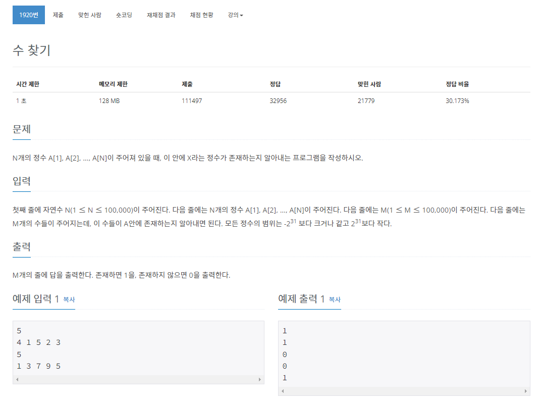 첫째 줄에 자연수 N(1 ≤ N ≤ 100,000)이 주어진다. 다음 줄에는 N개의 정수 A[1], A[2], …, A[N]이 주어진다. 다음 줄에는 M(1 ≤ M ≤ 100,000)이 주어진다. 다음 줄에는 M개의 수들이 주어지는데, 이 수들
