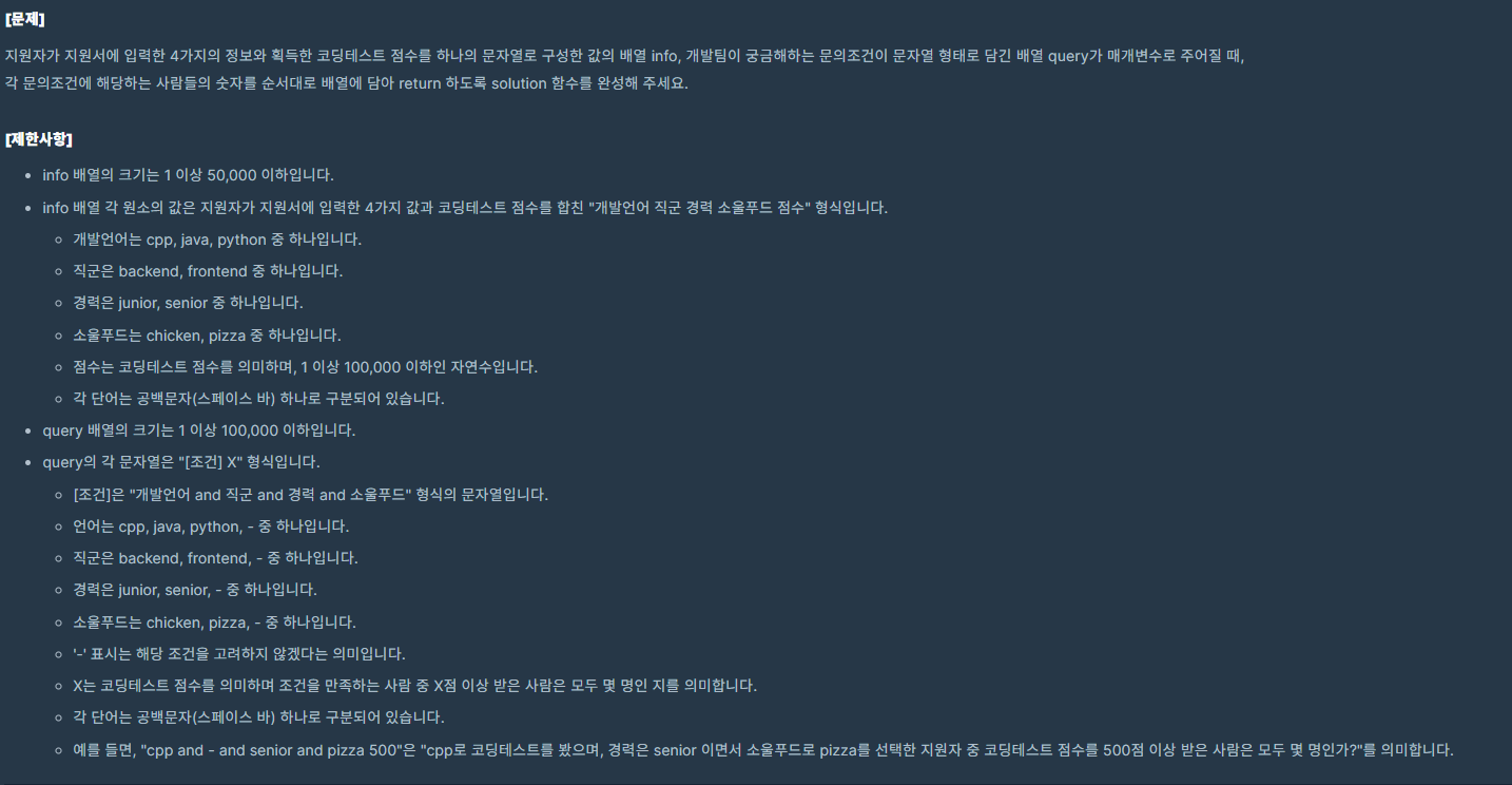 - 정렬후 점수 데이터를 통해 이진탐색을 하여 query[]에 해당하는 인원 수를 찾음