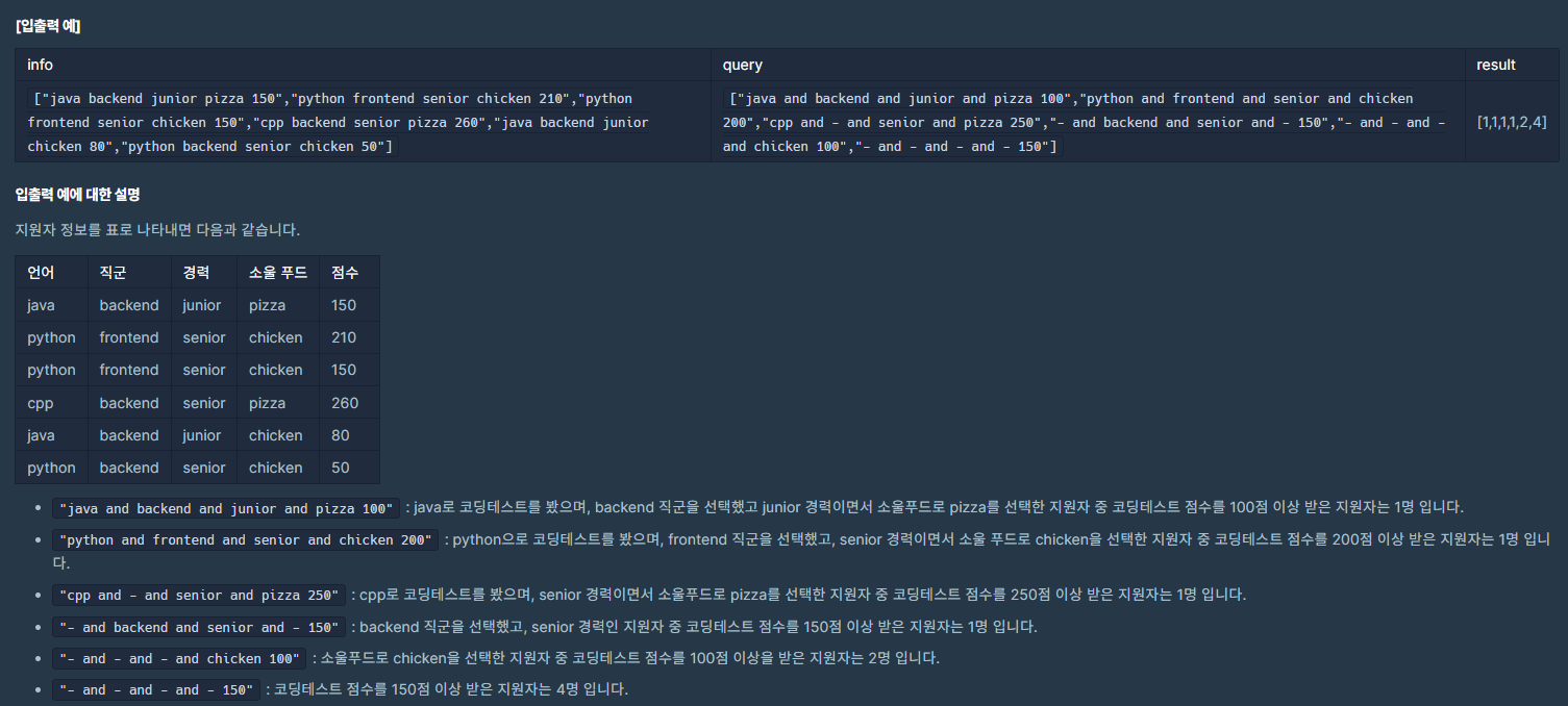 - info로 주어지는 데이터들을 공백을 포함한 query에 뽑힐 수 있는 모든 경우의 수를 조합하여 Map에 저장