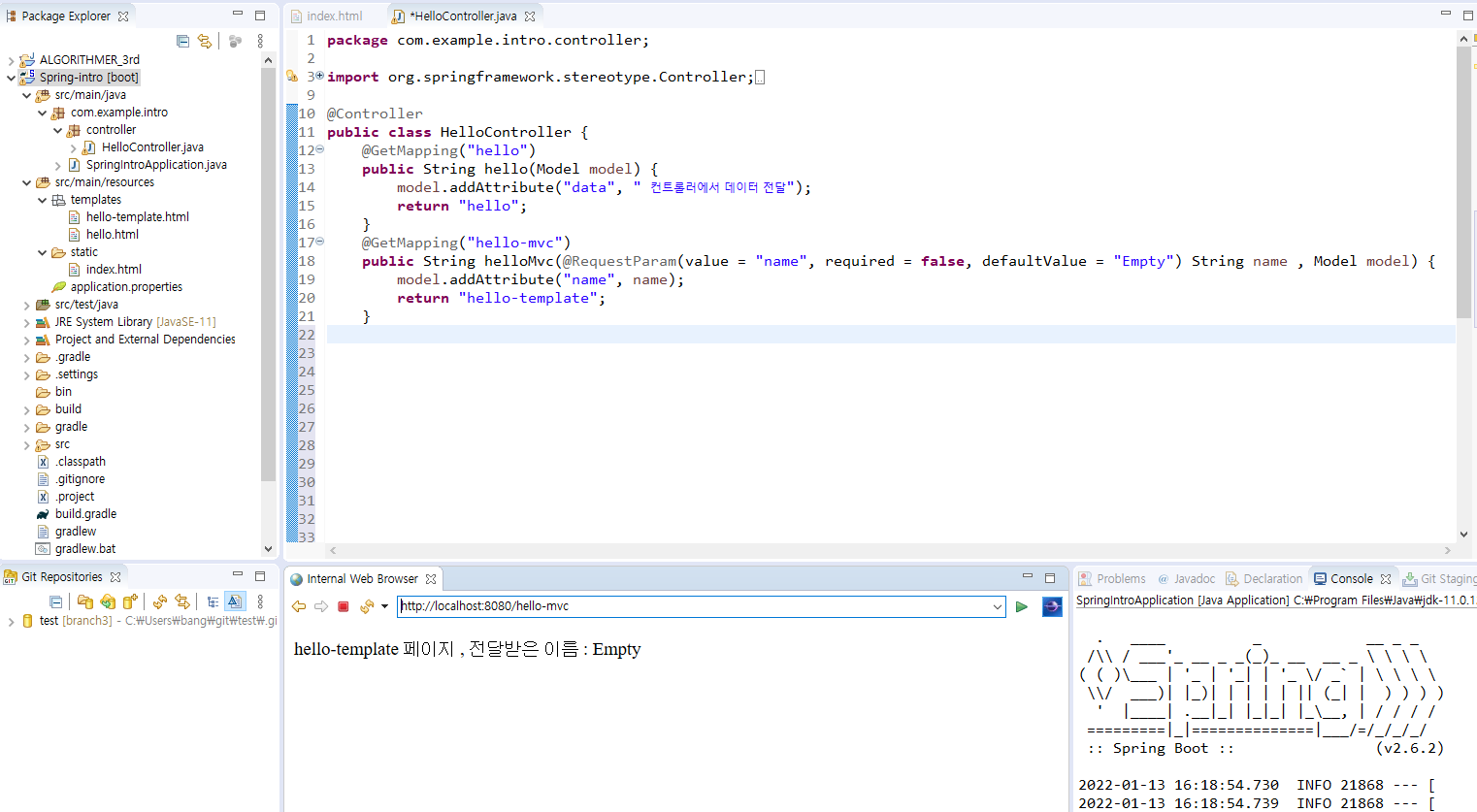 model.addAttribute("data", " 컨트롤러에서 데이터 전달");
