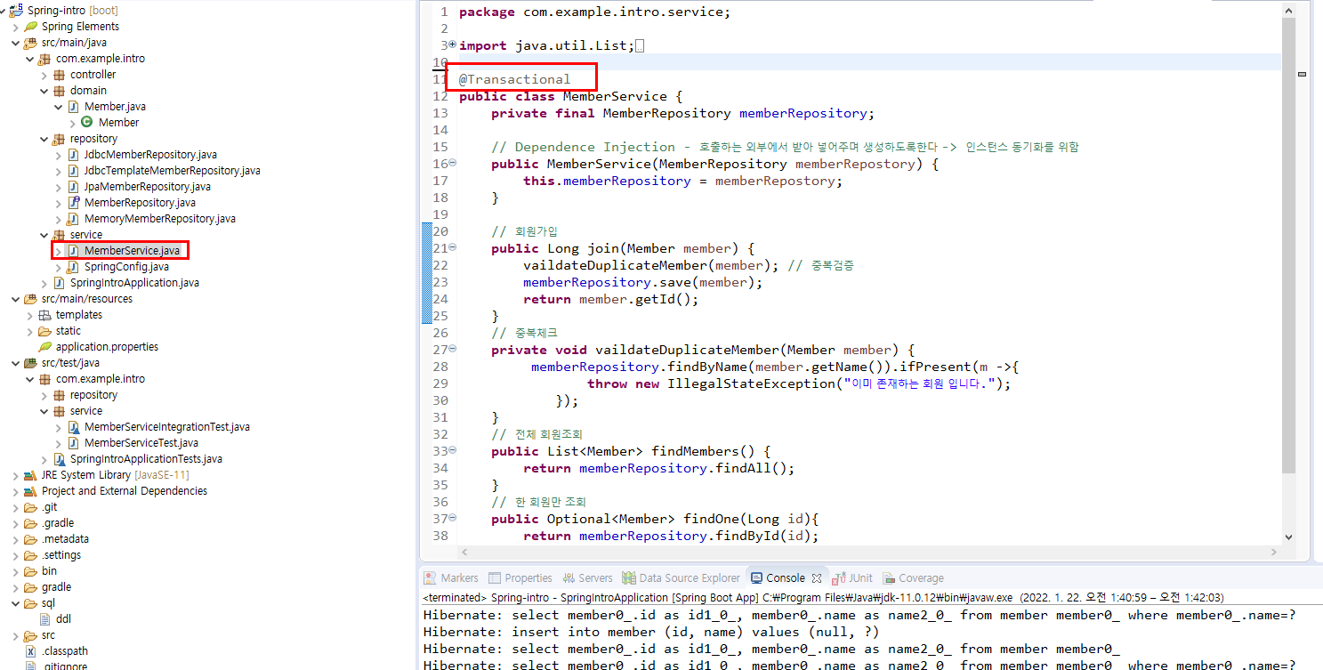MemberService에서 @Transactional 명시