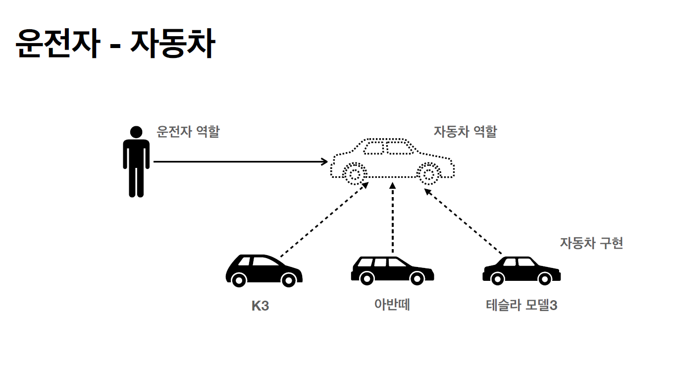 운전자가 자동차를 가질 수 있고, 이 두 객체는 각각 다른 역할을 가진다.