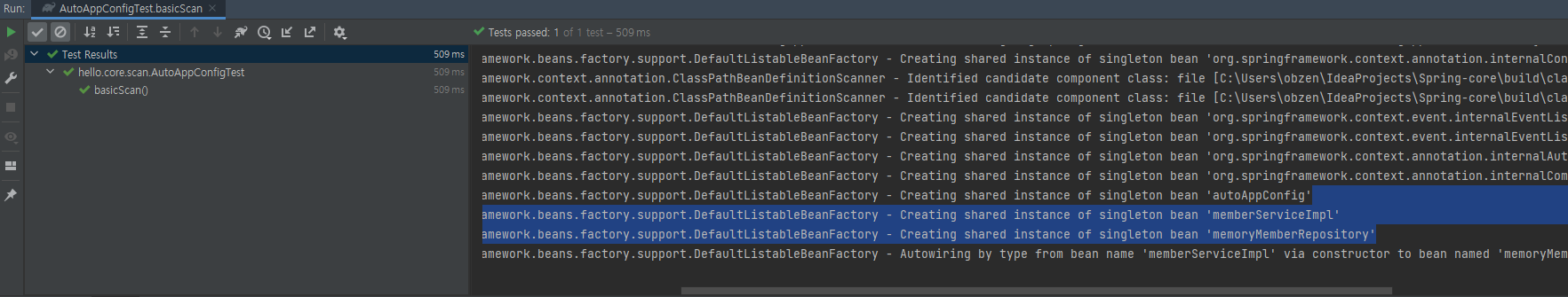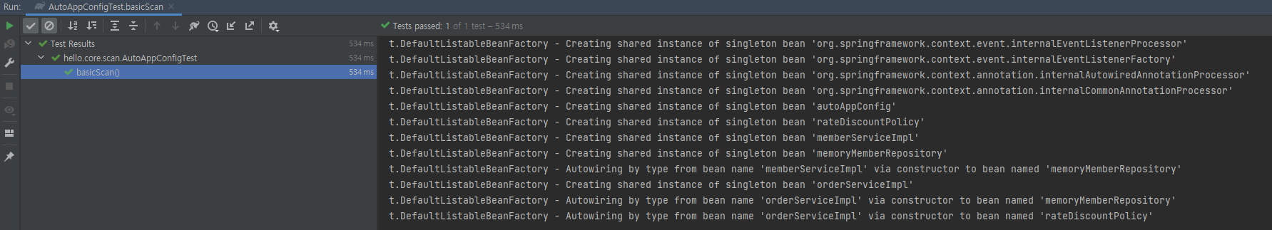 이렇게 변경해주었다면, 이제 AppConfig 없이도 빈 등록과, 의존성이 전부주입된 싱글톤 패턴의 서비스가 수행이 된다.Test를 진행해보자.