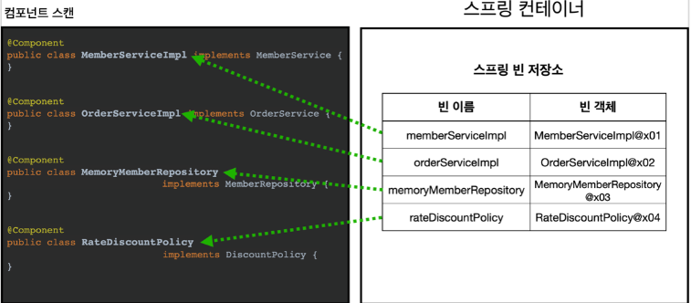 각각의 빈을 AppConfig가 아닌, 자체적으로 클래스안에서 @Component 를 명시하여 등록하고,