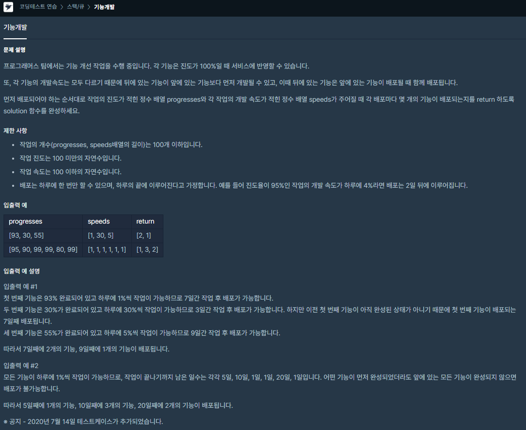 프로그래머스 팀에서는 기능 개선 작업을 수행 중입니다. 각 기능은 진도가 100%일 때 서비스에 반영할 수 있습니다. 또, 각 기능의 개발속도는 모두 다르기 때문에 뒤에 있는 기능이 앞에 있는