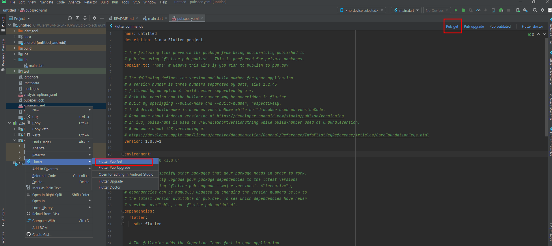 프로젝트 안에서 사용하기 위해서는 반드시 pub get 이 진행되야 합니다.