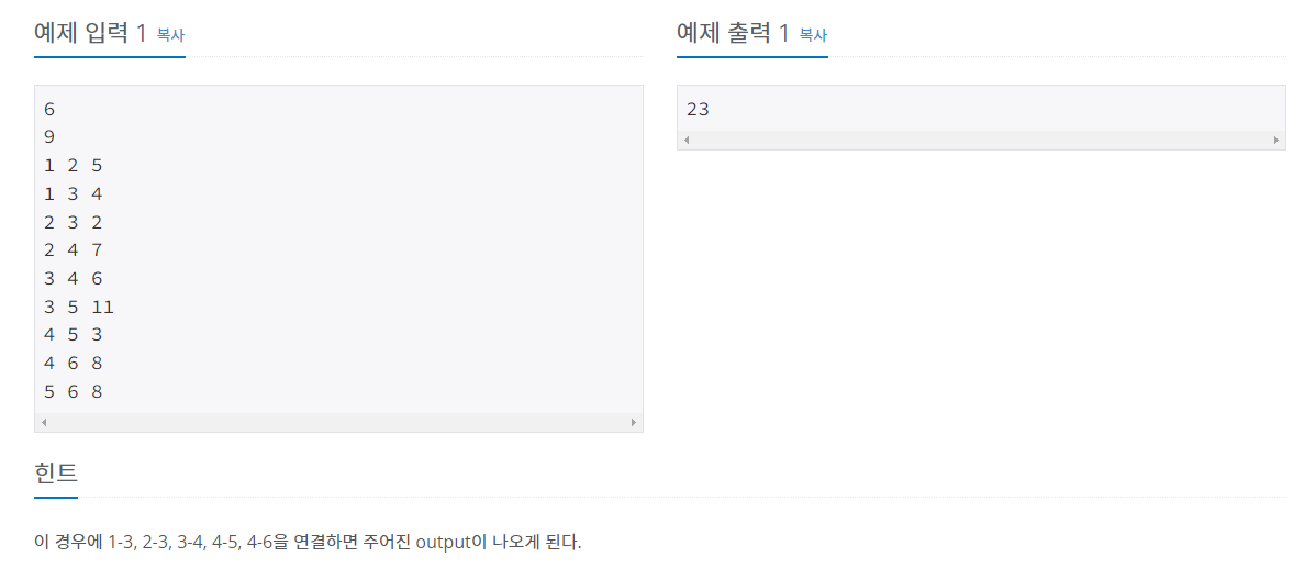 모든 노드를 연결되는 최소비용을 구해주면 된다.