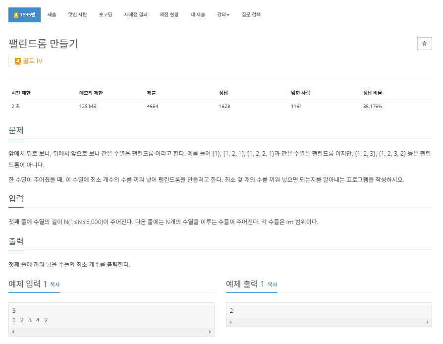 입력 수가 주어지면, 해당 수열에 몇번의 숫자를 끼워 넣어야 팰린드롬으로 만들수 있는지를 구한다.