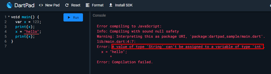Dart에 var는 입력이 주어지게되면 해당 타입으로 타입 종류가 정해지게 됩니다.
