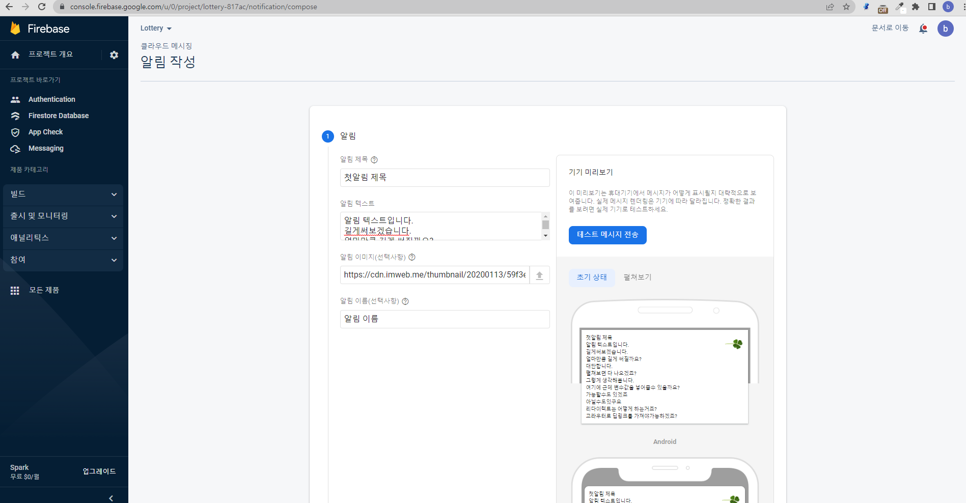 테스트 메세지 발송을 누르면