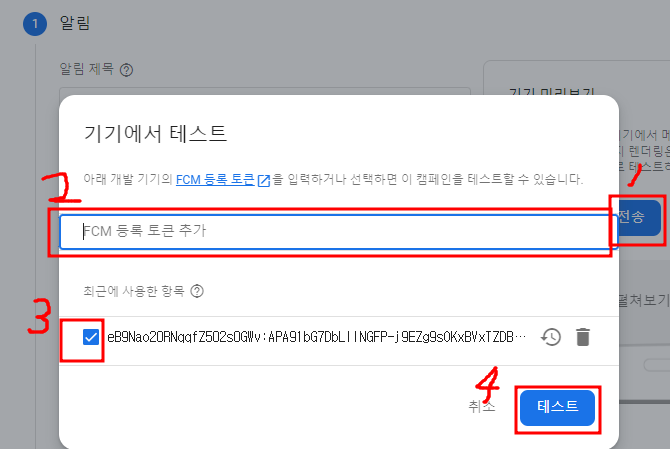테스트할 기기에 FCM 토큰을 수동으로 넣어줘야 한다 .