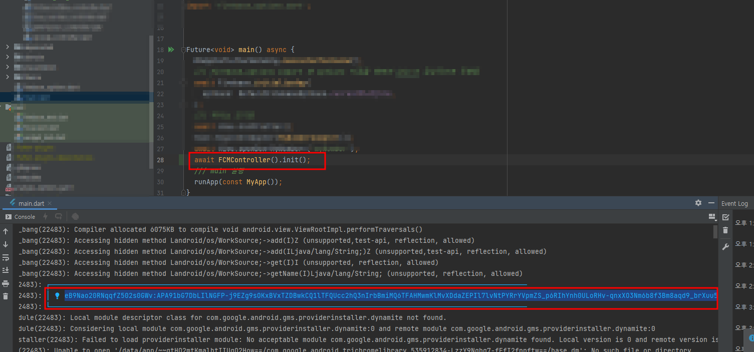 아래와 같이 해당기기에 토큰을 받아 찍어보는 구문을 넣고
