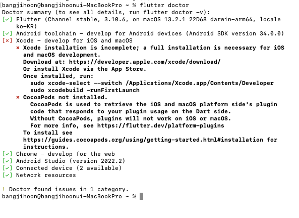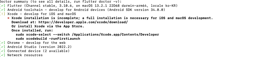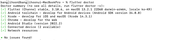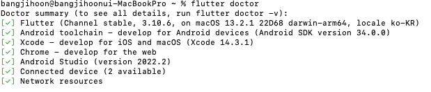 flutter doctor시 아래와 같이 나오면 정상 설치 완료