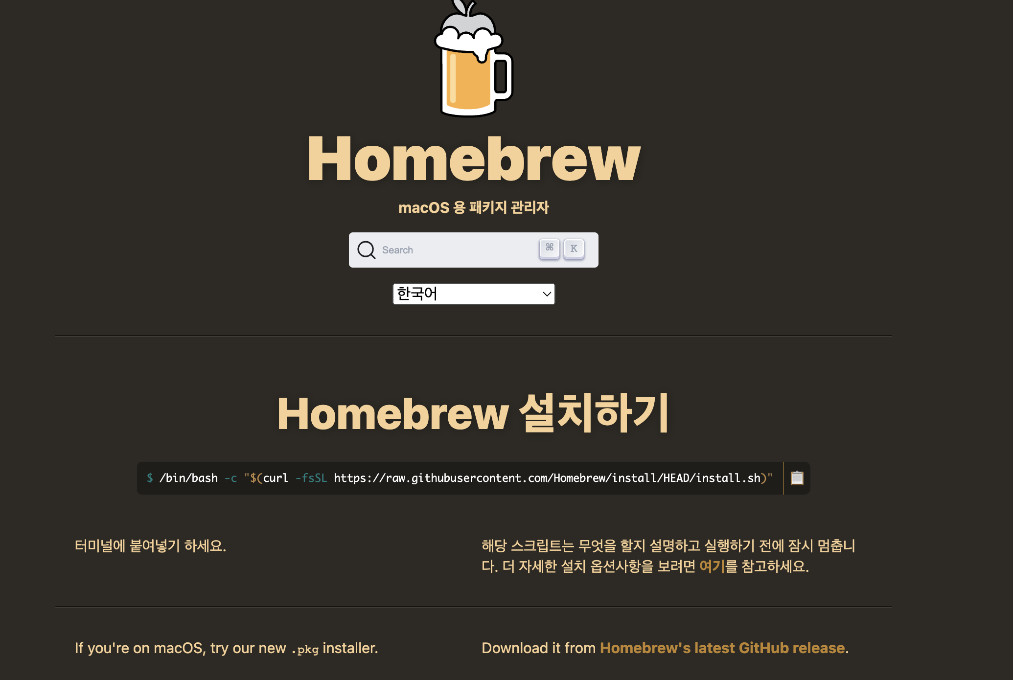 homebrew는 위 사이트에서 해당 커멘드를 복붙하여 터미널에 입력하여 설치하면 된다.