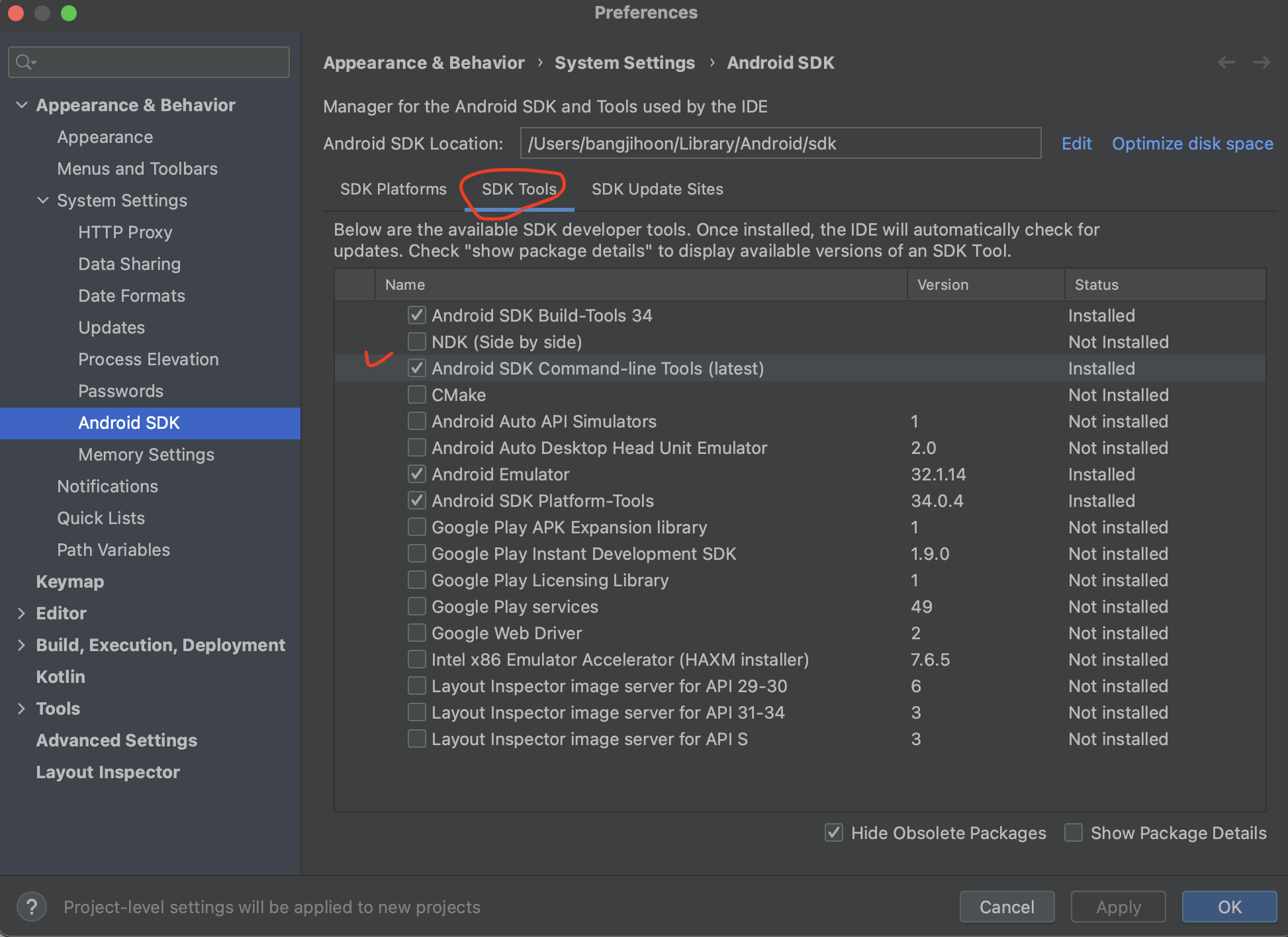위와 같이 sdk 매니저에서 tools중에 command-line tools설치를 진행해주면