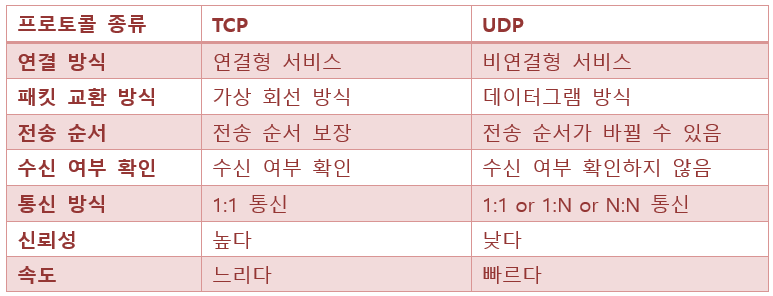 TCP와 UDP는 OSI 전송계층(4계층)에 해당하는 서비스로 데이터를 전송하는 방법이 서로 다르다.