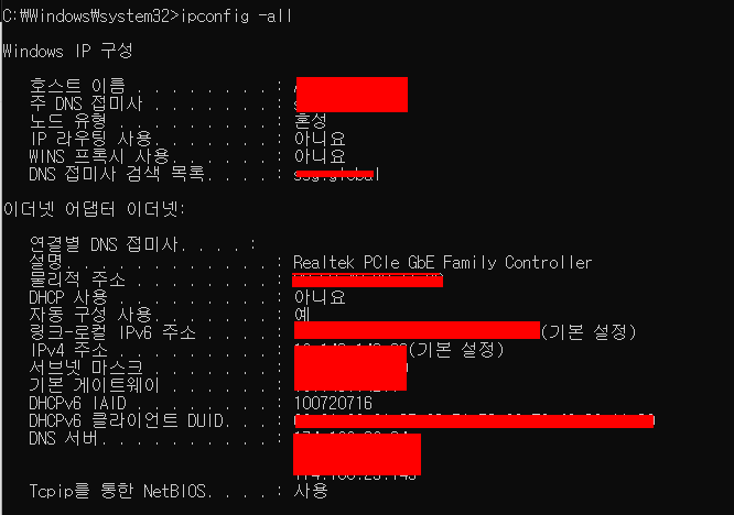 ip / mac / 도메인 / 게이트웨이 등 모든 정보 : ipconfig -all