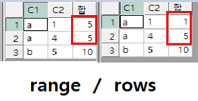Range는 논리적으로 기준값이 같은 Row들은 하나의 그룹으로 취급하여, SUM의 값을 반환해준다.