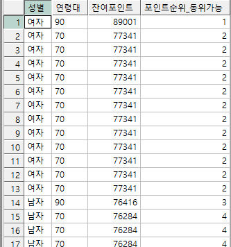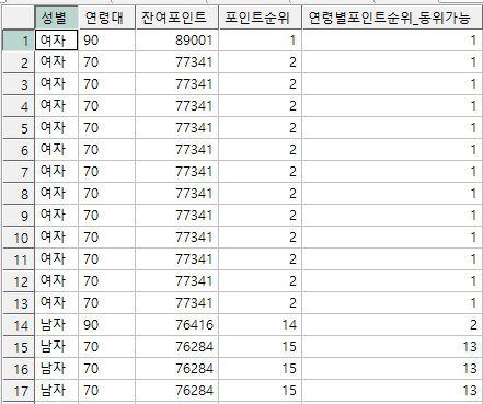 ,rank() over (partition by AGES_DIV_CD order by REST_PNT_AMT desc) 연령별포인트순위_동위가능
