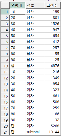 연령대별, 성별 고객의 수를 구하는데, 여기서 중요한것은 rollup은 group by 순서가 중요하다.